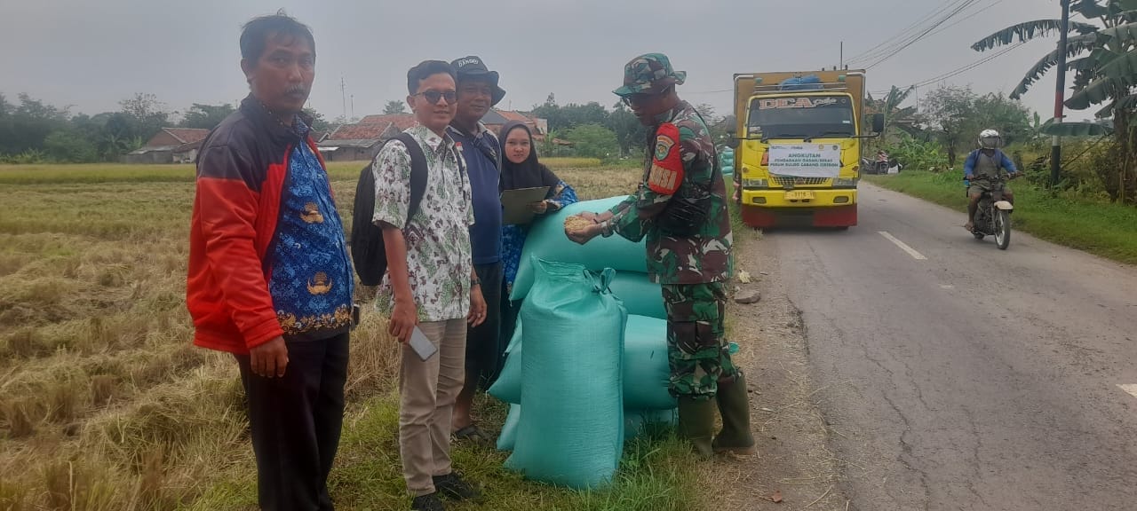 Kegiatan ini dipimpin langsung oleh Danramil 1713/Ligung, Kapten Inf Sarna, yang bersama Tim Sergab Bulog melakukan koordinasi dan pemantauan terhadap hasil panen gabah milik petani setempat.